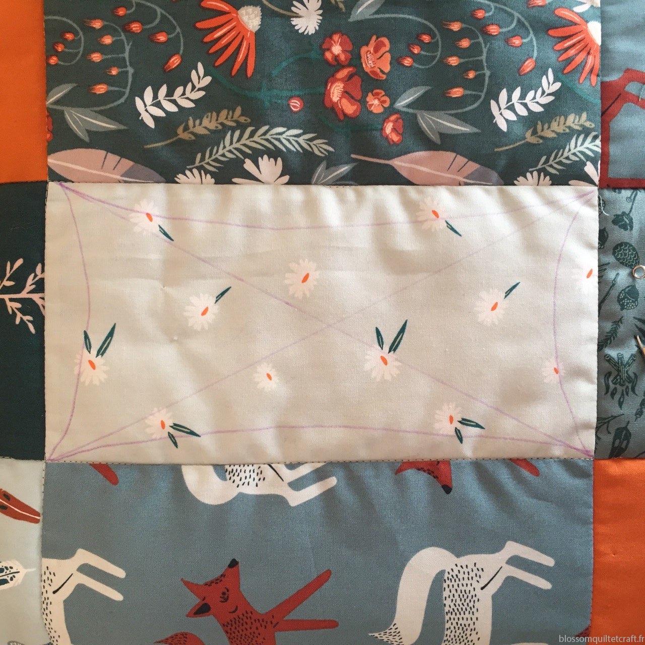 Pour le top, j’ai choisi de coudre ensembles des simples rectangles. Ces formes sont très faciles à couper avec la règle 6 1/2 x 12 1/2 inches sur le format Fat Eighth. Taille des rectangles : 5 1/2 x 4 1/2 inches.