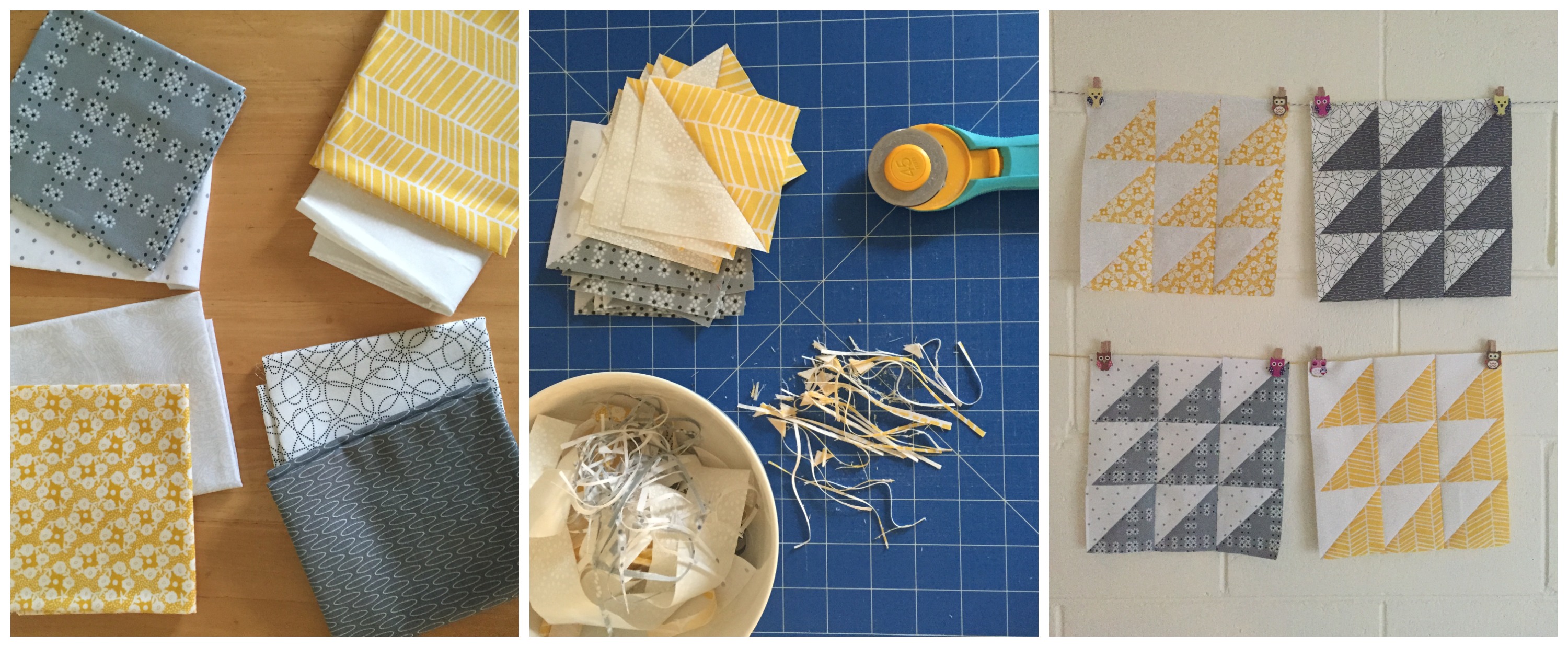 Notre reine désirait un code couleur bien particulier: un triangle jaune ou gris avec un triangle « low volume ». Les tissus « low volume » sont très à la mode dans le milieu du quilting en ce moment. Il s’agit de tissus très pâles (voire blancs) qui ont de tous petits dessins dessus. De loin, le tissu parait uni mais à y regarder de plus près, on peut apercevoir de petits détails. Ces tissus « low volume » sont souvent utilisés comme arrière plan. Le bloc étant relativement petit, j’ai décidé d’en coudre quatre.