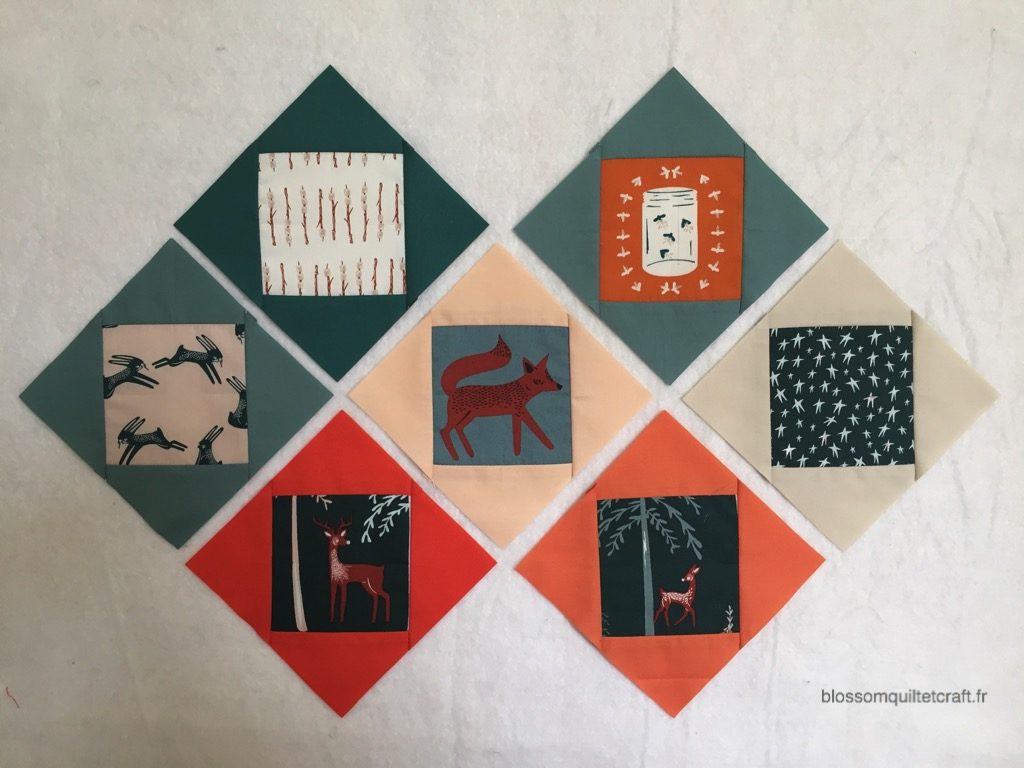 Voici la première étape réalisée. A ce stade là déjà, j’aime beaucoup le rendu. J’ai pris soin de découper à la manière « fussy cut » pour les gros motifs de la collection comme le renard, le bocal de lucioles et les biches. Notez bien que vous allez « gâcher » un petit peu de tissu en coupant de la sorte, mais dans ce cas le résultat en vaut la peine, je trouve.